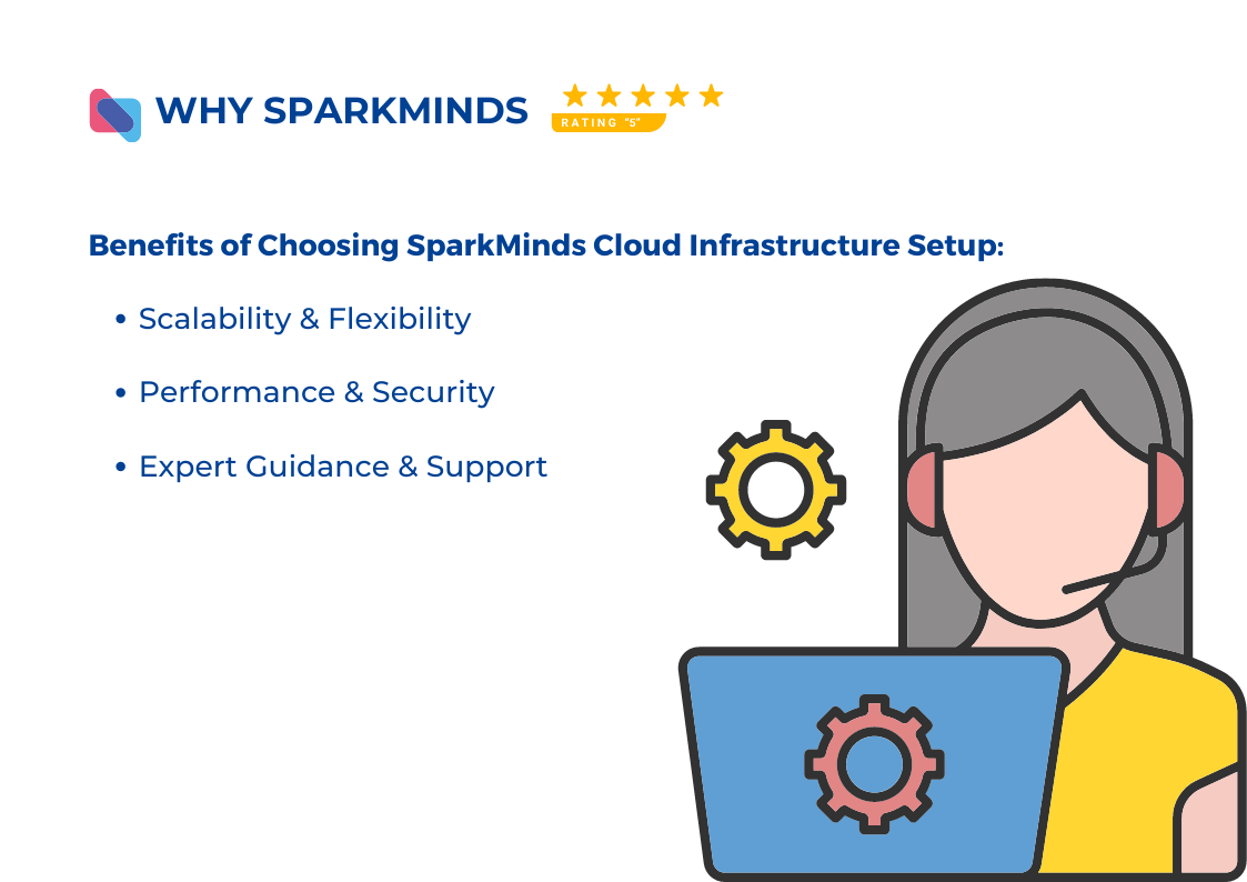 • Scalability and Flexibility: As your business grows, your web application needs to scale and adapt to accommodate increasing demands. SparkMinds’ services are designed to create scalable and flexible solutions. We build robust architectures and utilize scalable technologies that allow your web application to handle growing user traffic, expanding data volumes, and evolving business requirements. Our solutions provide the flexibility to integrate new features, functionalities, and third-party services seamlessly, ensuring that your cloud infrastructure setup remains future-proof and adaptable to your changing needs.