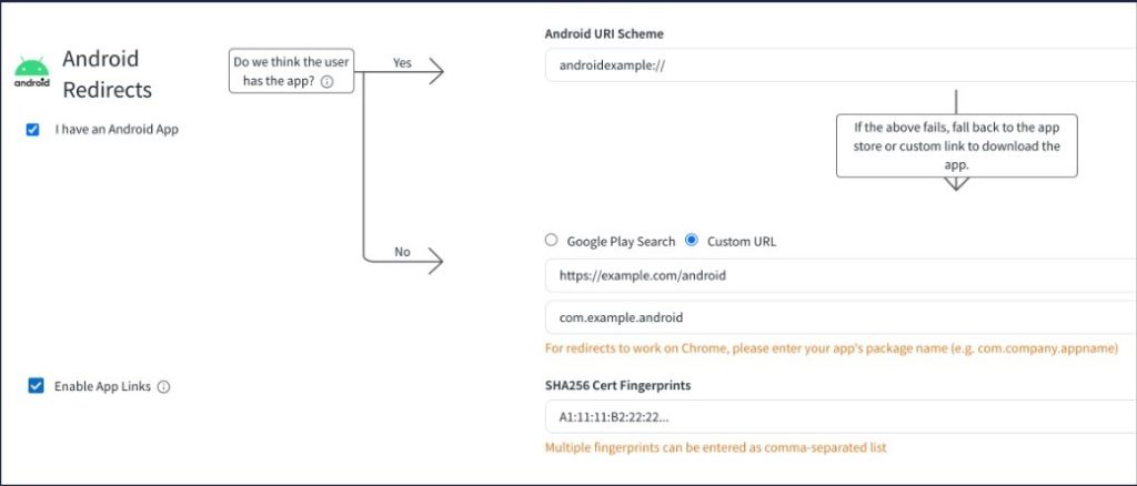 Ensure that both the “I have an Android App” and “Enable App Links” options are checked. Fill in the values for “Android URI Scheme” and “Custom URL” specific to your app.