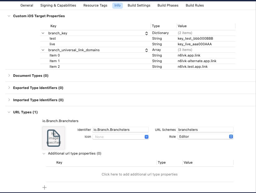 - Note: The Branch iOS SDK will pull the first URL Scheme from your list that is not fb, db, or pin. This value will be used one time to set the iOS URL Scheme in your Link Settings of the Branch Dashboard.