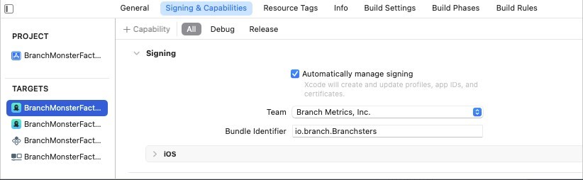 - Return to the “Signing & Capabilities” tab in Xcode, and add the domains from your Branch Dashboard to your project’s target.