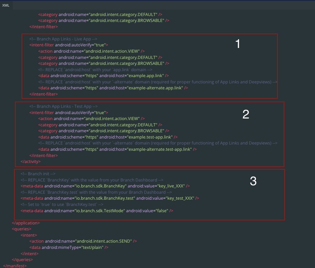 - To configure your app to use the Branch Android SDK, you will need to update your AndroidManifest.xml file.