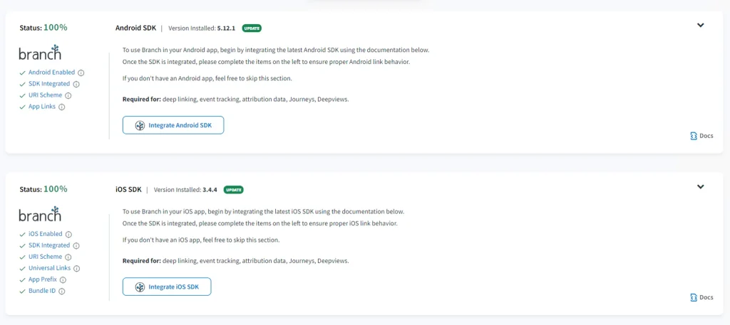 Make sure that the status of both the Android SDK and iOS SDK is fully 100% on Branch Dashboard