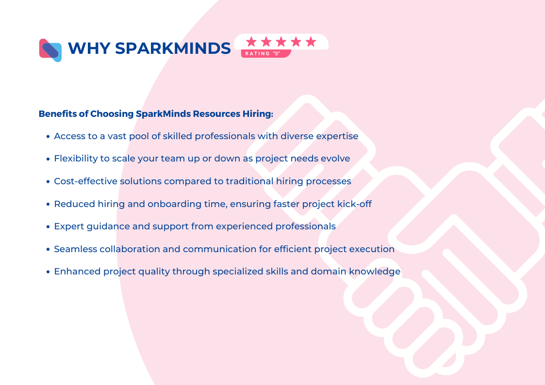 That’s where SparkMinds comes in. Our comprehensive Resources Hiring solutions, including the ODC (Offshore Development Center) Model, IT Staff Augmentation, Project-based, and Team-based approaches, can revolutionize your business by providing the expertise and flexibility you need to thrive. Let us explore why your business needs SparkMinds Resources Hiring.