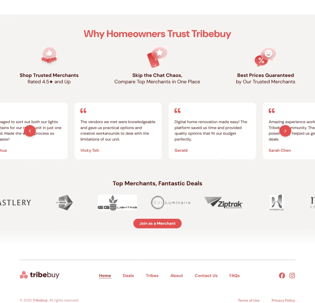 TribeBuy is a Singapore-based community-driven group-buy platform tailored for condominium residents—“Condo Tribes”—to access exclusive bulk-purchasing deals on home-related products and services. Acting as a trusted intermediary, the platform aggregates merchants offering lighting, furniture, movers, water purifiers, curtains, and more. TribeBuy negotiates special pricing, curates highly rated vendors, and provides a streamlined experience for group purchase coordination. Users can easily select their condo development, browse vetted deals, and connect with merchants via WhatsApp or schedule on-site appointments, all through a simplified and centralized interface