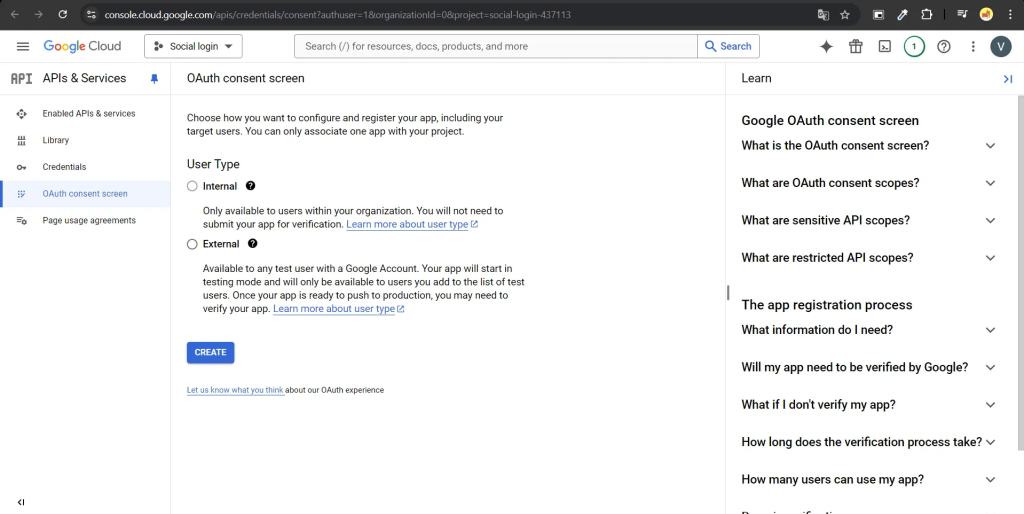 Internal→ only allows users with a Google account within the same organization as you. In this case, we choose External.