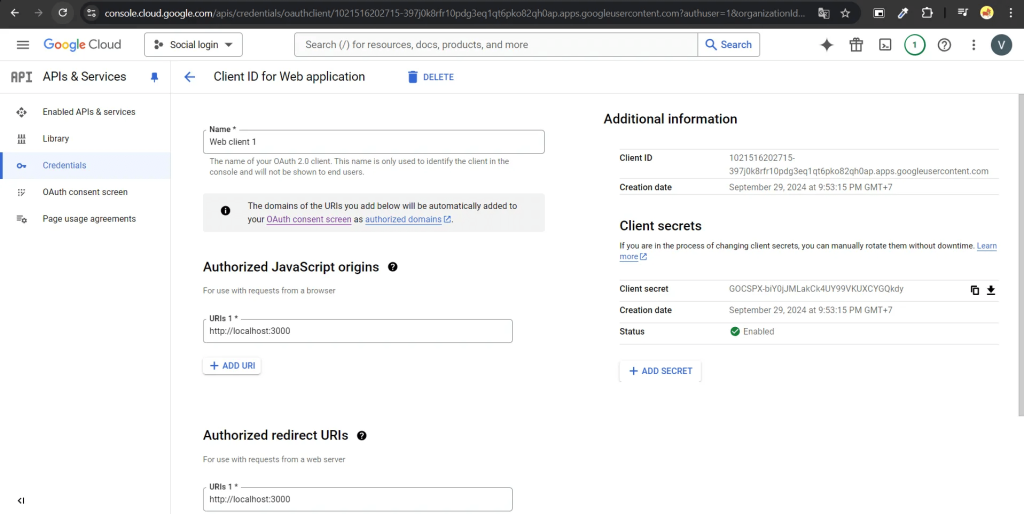 - After the Client ID has been created successfully, copy the Client ID and Client secret into .env file