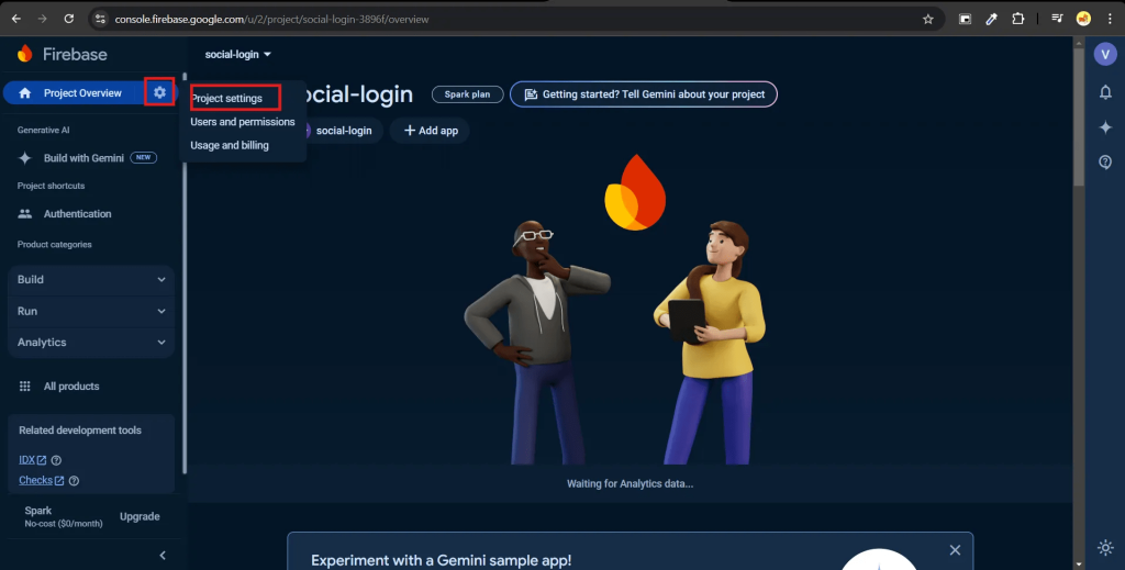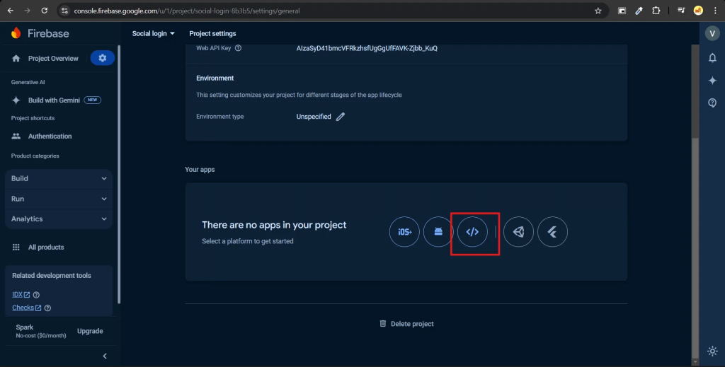 - To get the Firebase configuration information for your web, we click Project settings in the Project Overview tab. Choose icon </>