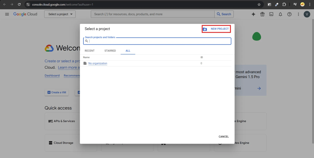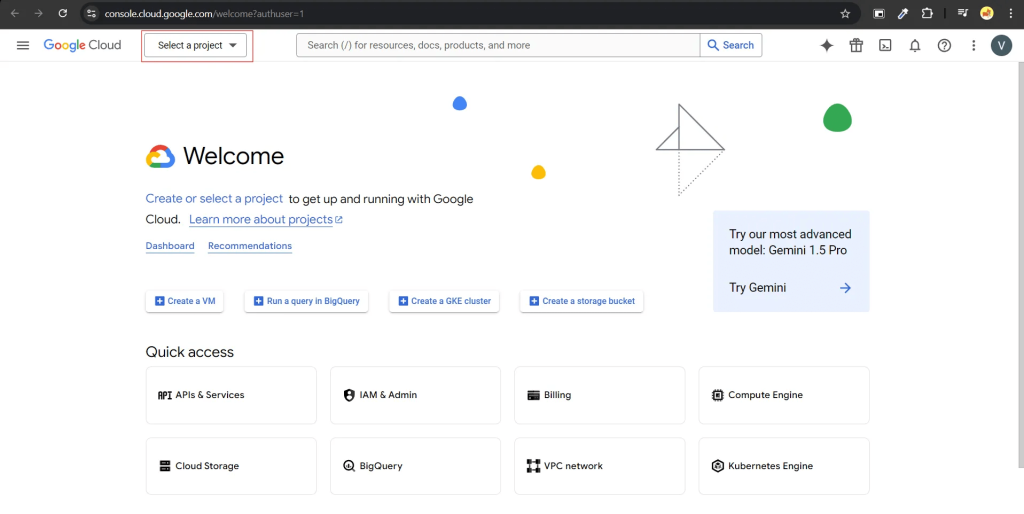 - Go to https://console.cloud.google.com/ and log in with your Google account.