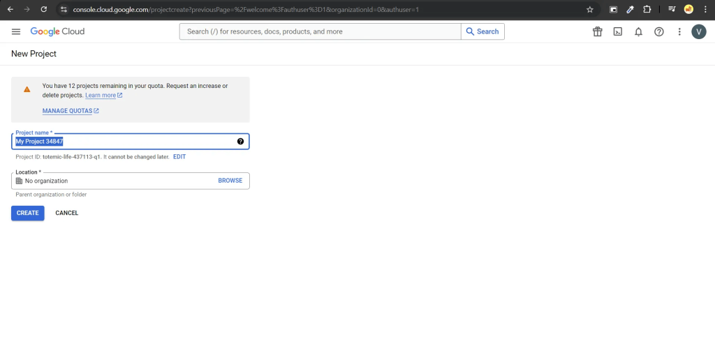 - Fill in the information in the Project name. Users will see this name when they continue to log in. Note that this name cannot be changed once it is set. The Location section can be set as default. When you are done, click “Create”.