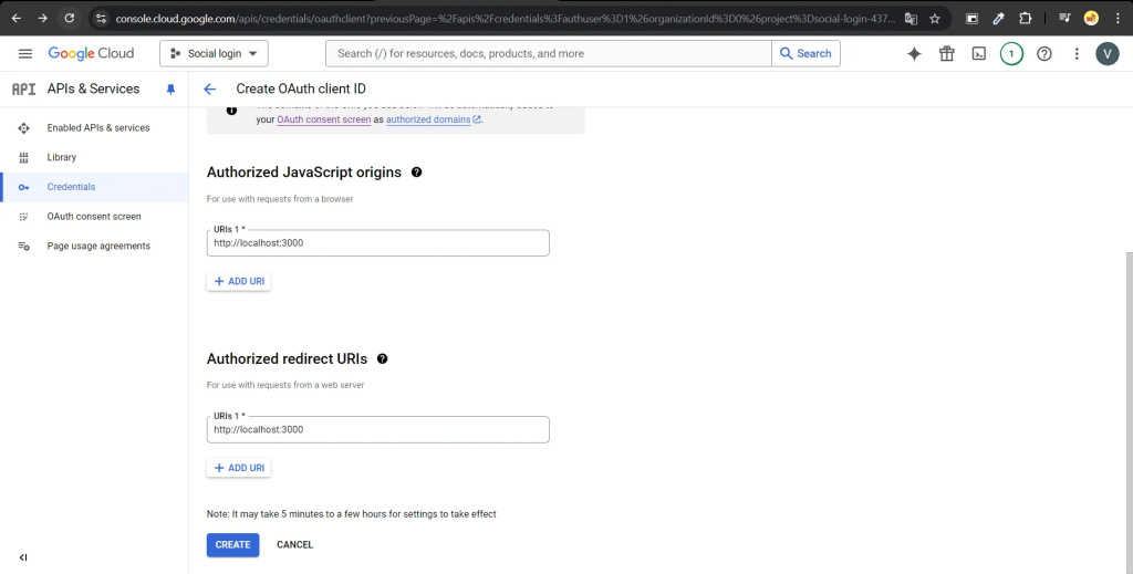 Authorized redirect URIs: This is the URL to which users will be redirected after successful authentication. After filling in all the information as shown in the image, select CREATE.