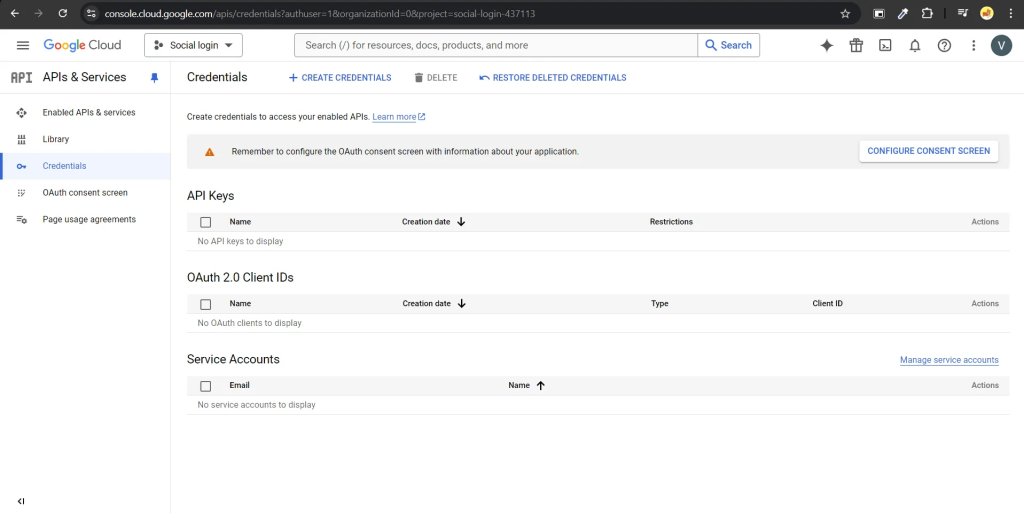 - Next, we need the Client ID configuration. This helps Google identify and verify your application, allowing it to authenticate and grant access to Google account information. However, you first need to configure the OAuth consent screen. This is a display screen when users grant the application access to their protected information, such as their Google account details. Click CONFIGURE CONSENT SCREEN on the right corner of the screen.