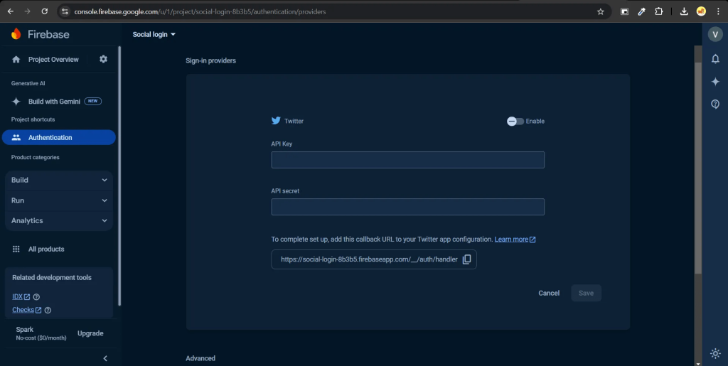 - After creating a project, select Authentication, next choose Get started, and finally click Sign-in method. First of all, we should configure Twitter..