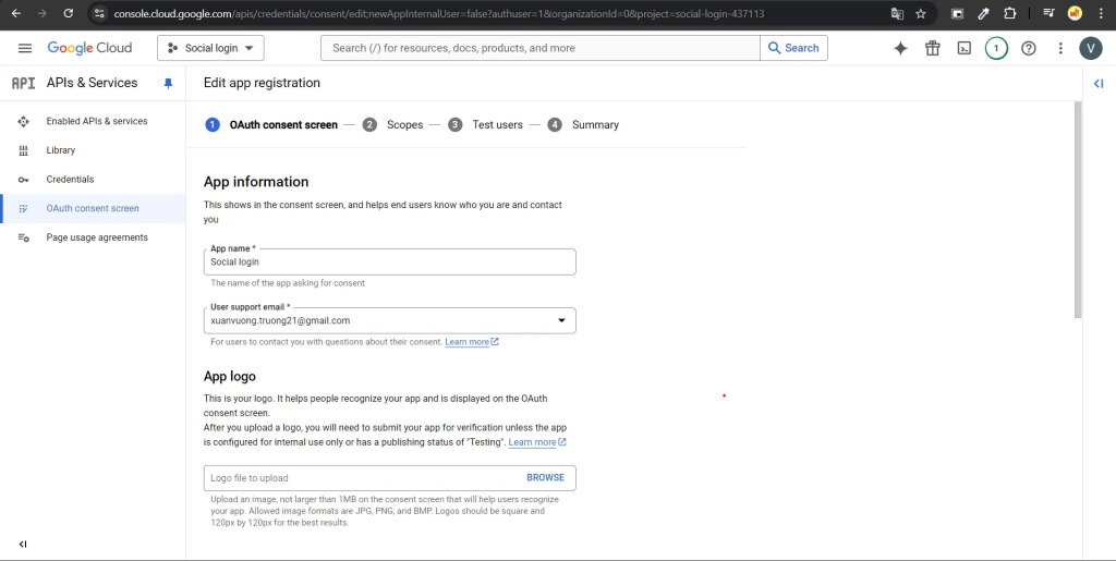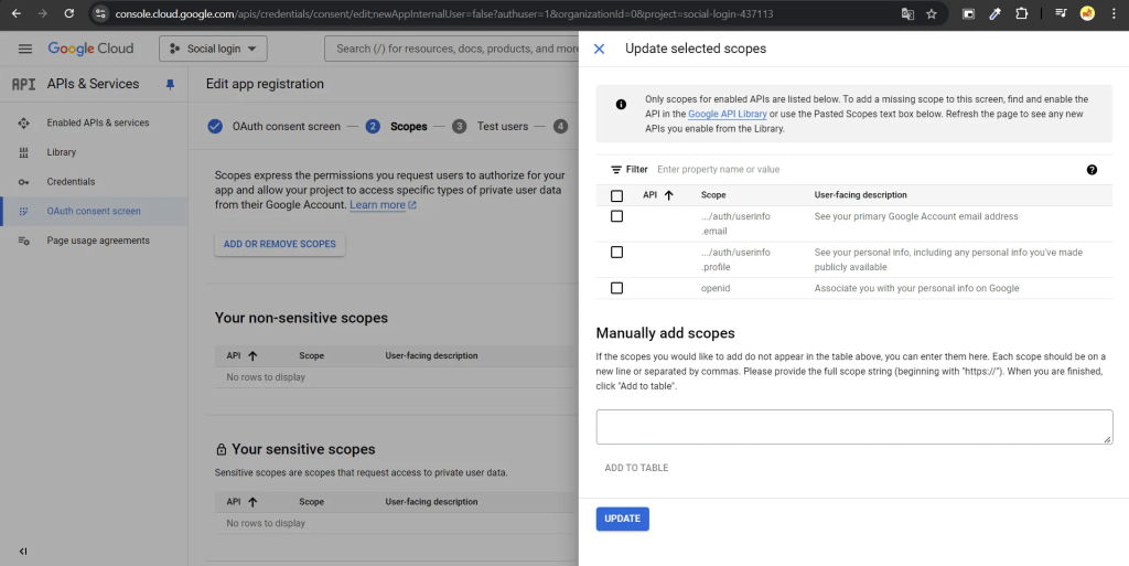 - In the Scopes tab, you will configure the details that your application will request from users. Next, click SAVE AND CONTINUE and choose BACK TO DASHBOARD