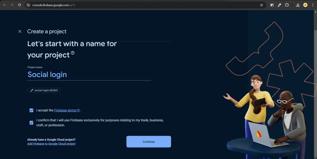 - Fill in the necessary details, then click Continue twice and choose Create project. You need to wait a moment for the system to configure your project.
