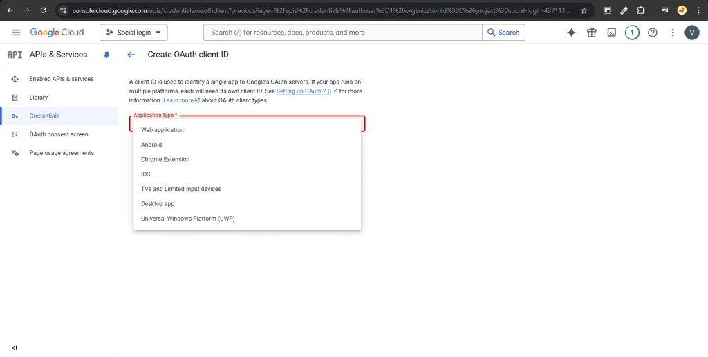 - After configuring the OAuth consent screen, move back to the Credentials tab and choose CREATE CREDENTIALS → OAuth client id. Select “Web application” in the “Application type” field.