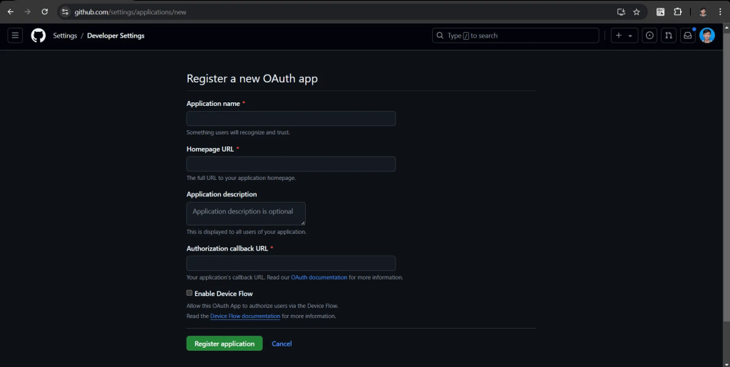 - Fill in all the information with the Authorization callback URL (3)* temporarily set to http:localhost:3000, which will be replaced with the link from Firebase later.