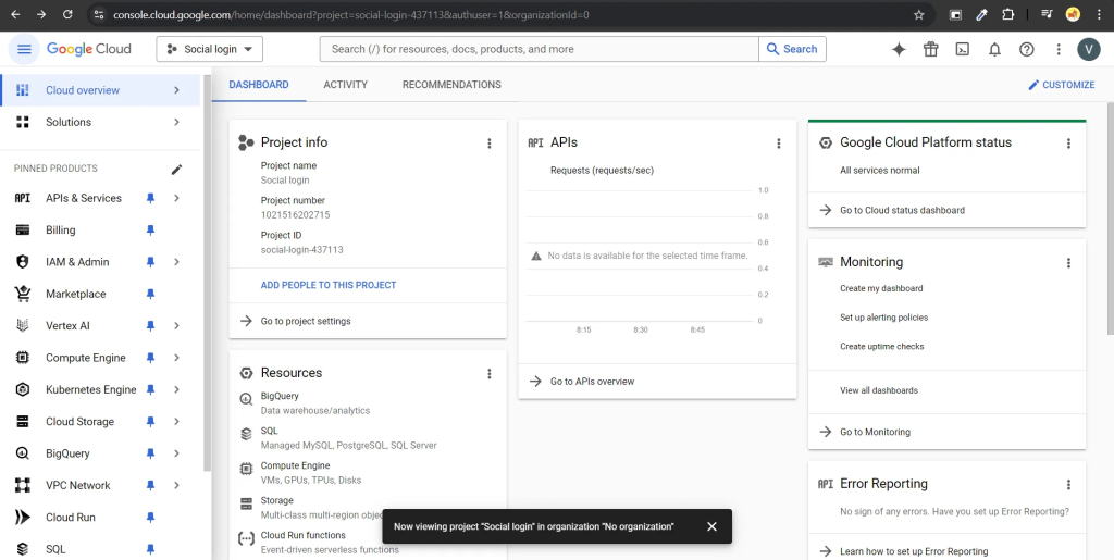 - Once you create a project successfully, the interface will be shown below. Click APIs & Services, and choose Credentials.