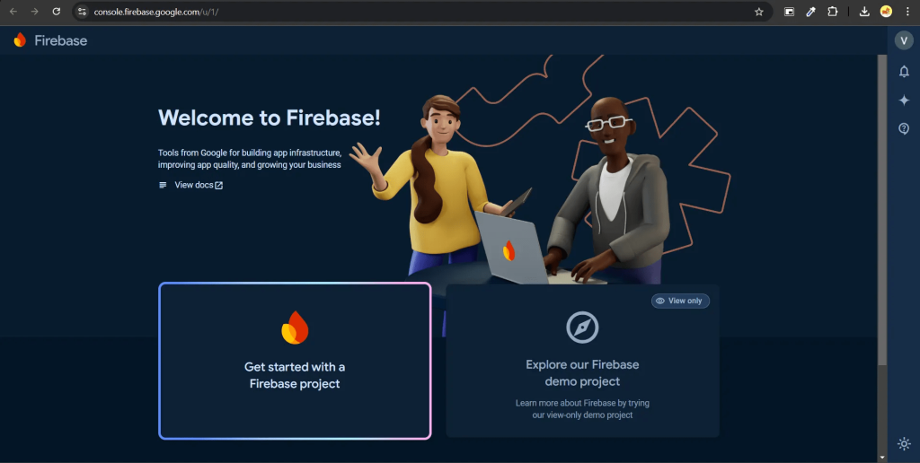 - Register at https://console.firebase.google.com/u/1/ by using your Google account. Then, select Get started with a Firebase project to get started.