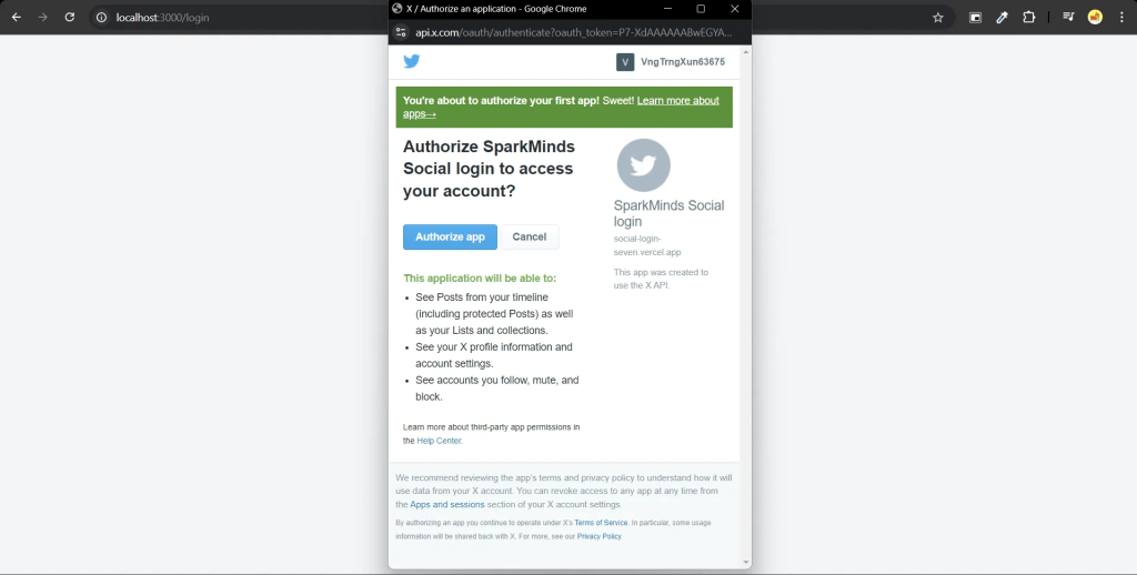 - In the “App permissions” section, select the appropriate permission for your application. About the “Type of app” section, choose “Web App, Automated App or Bot“. In the “App info” section, enter a valid temporary URL in the Callback URI / Redirect URL field to complete the configuration. You will change this URL after configuring Firebase (1*). For the Website URL, enter your website link. Note: you can’t use localhost, so you need to deploy the web or use another valid URL. After filling in all the information, click Save. Make sure to save the Client ID and Client Secret in the env file.